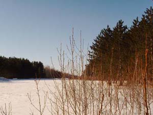 Some of the woods were cleared for farming in the early part of the last century, but layed fallow for many years. We bought the land in 1969. Some hobby farming was done in the 70's, but the sandy soil and early frosts were never much good for crops, and mostly wild hay was grown for the cow. The fields were planted into Norway (red) Pine in 1986, which are now a forest with all the wildlife expected, including bear, couger, deer, racoons, cyotees, rabbits, grouse, turkeys, eagles, and more. |